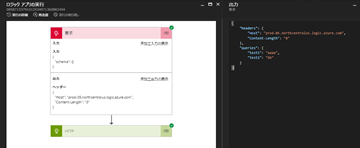 上記のように、HTTP コネクタが生成した呼出し用の URL に、test1=aaaa&test2=bb というクエリパラメータを追加しているのがわかります。そしてそのパラメータから、test1 で指定された値を取得しているのが、先ほどの triggerOutputs 関数を用いた記述になります。